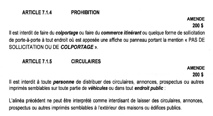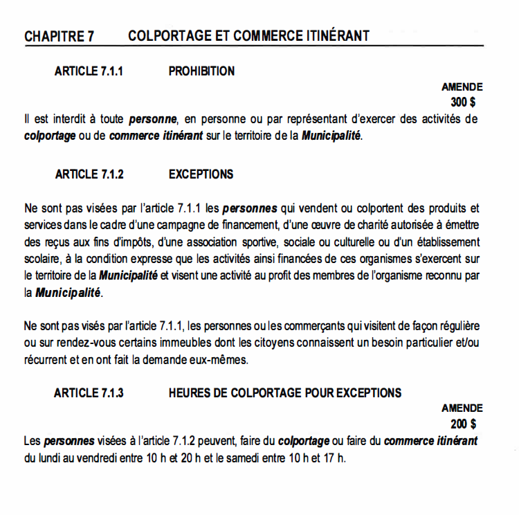 Voici un extrait du règlement S-2024-01 concernant le colportage.