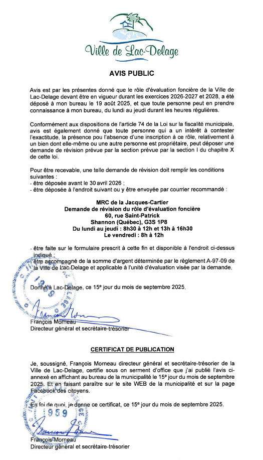 Pour consulter l'avis public concernant le nouveau rôle : Avis public rôle d'évaluation 2026-2027-2028